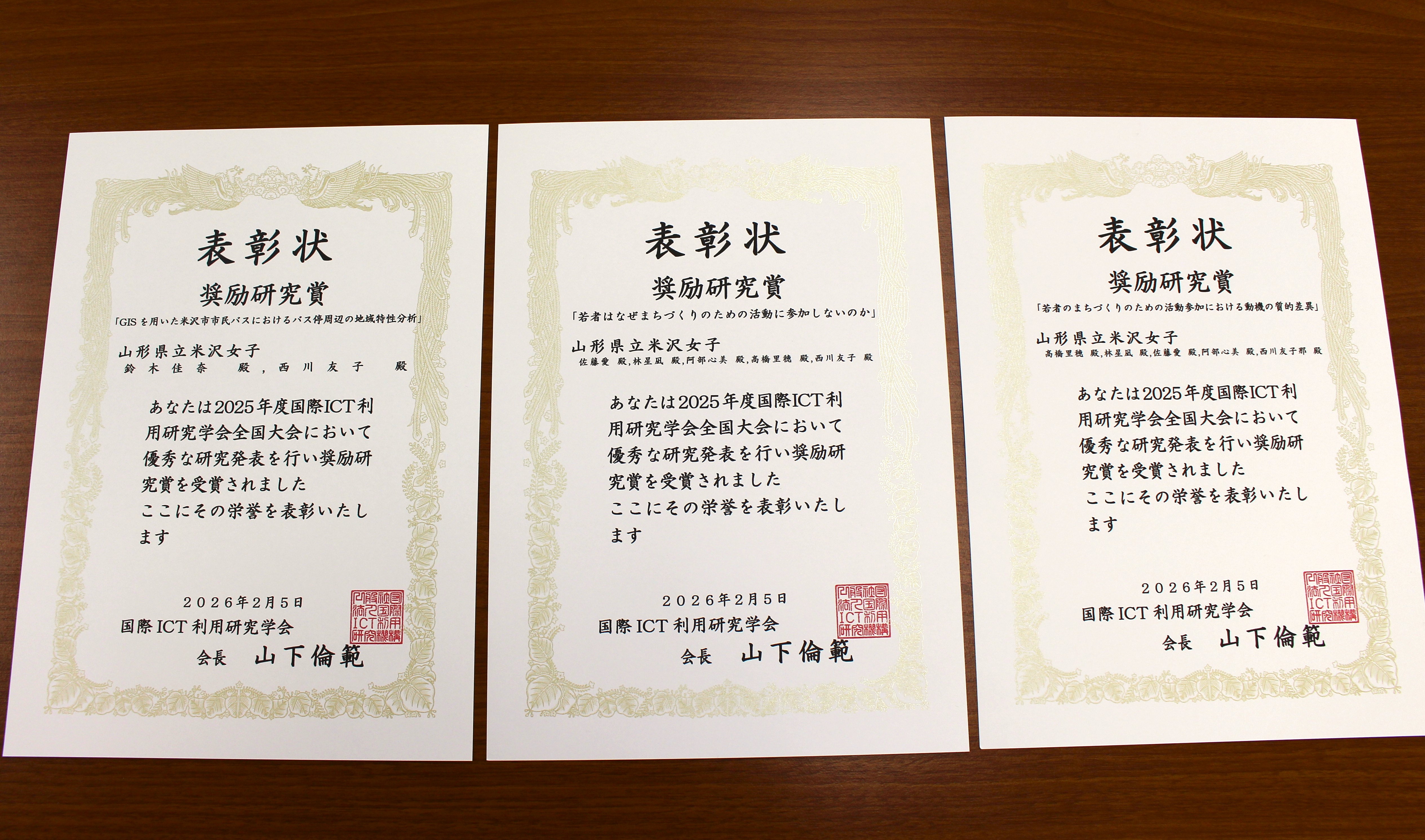 このたびは奨励研究賞という名誉ある賞をいただき、大変光栄に思います。米沢市での学生生活の中で生まれた興味・関心をもとに研究を進めてきたため、その成果が評価されたことをとてもうれしく思います。今回の学会発表を通して、研究の意義や今後の課題を改めて認識することができました。本受賞を励みに、結果に満足することなく、編入先においてもより一層深い学びと研究に取り組んでまいります。ご指導・ご支援くださった皆様に心より感謝申し上げます。