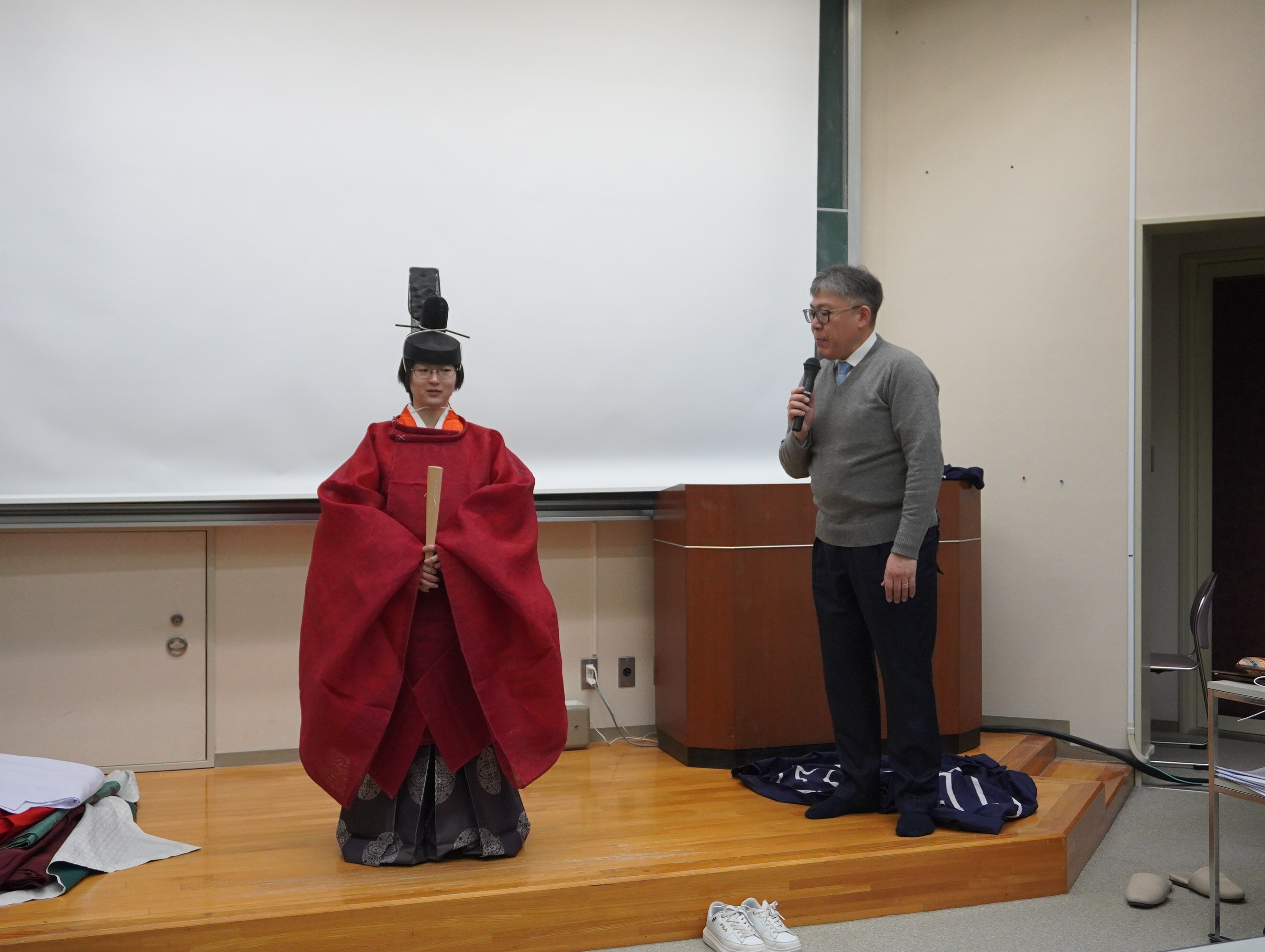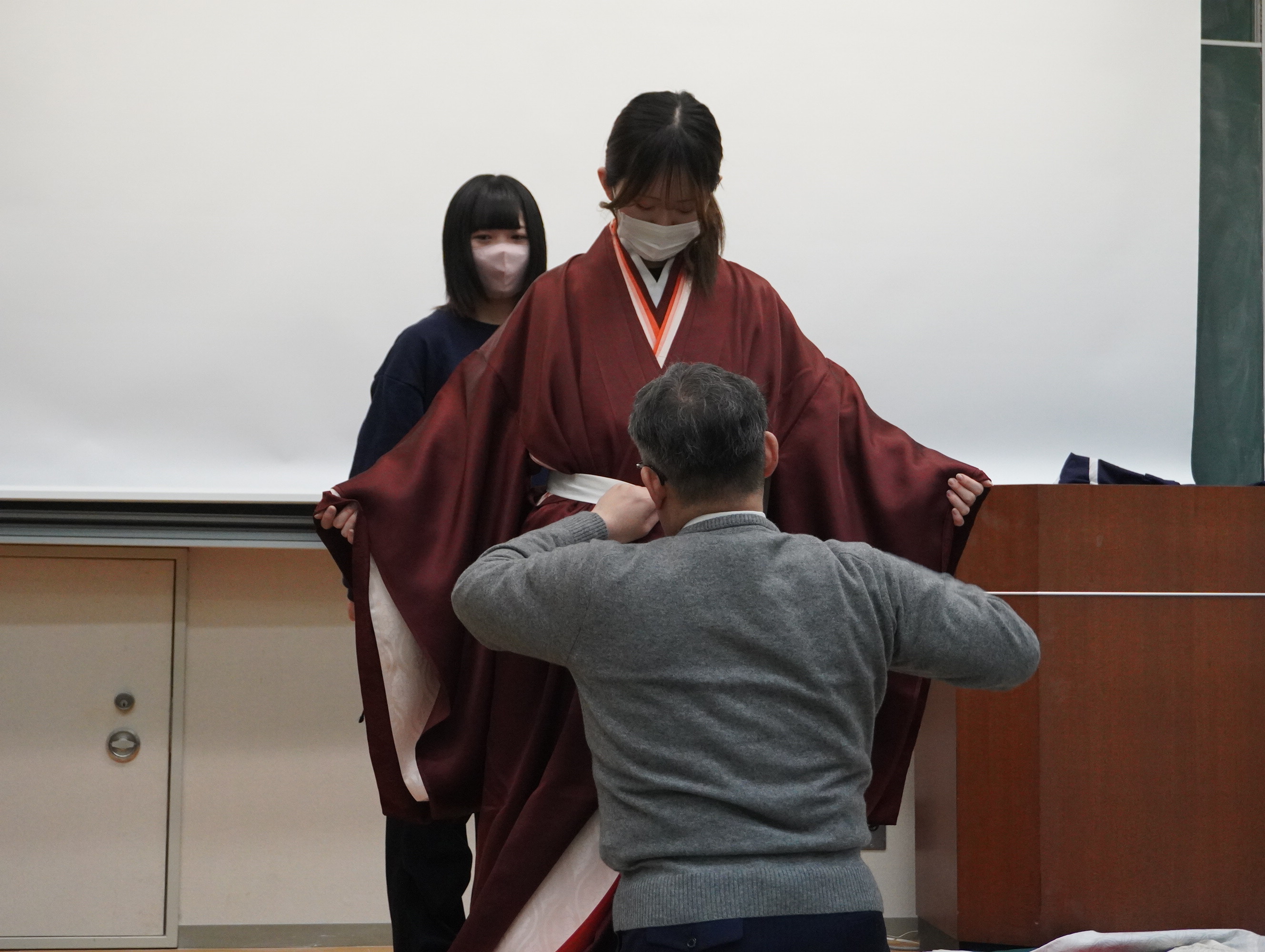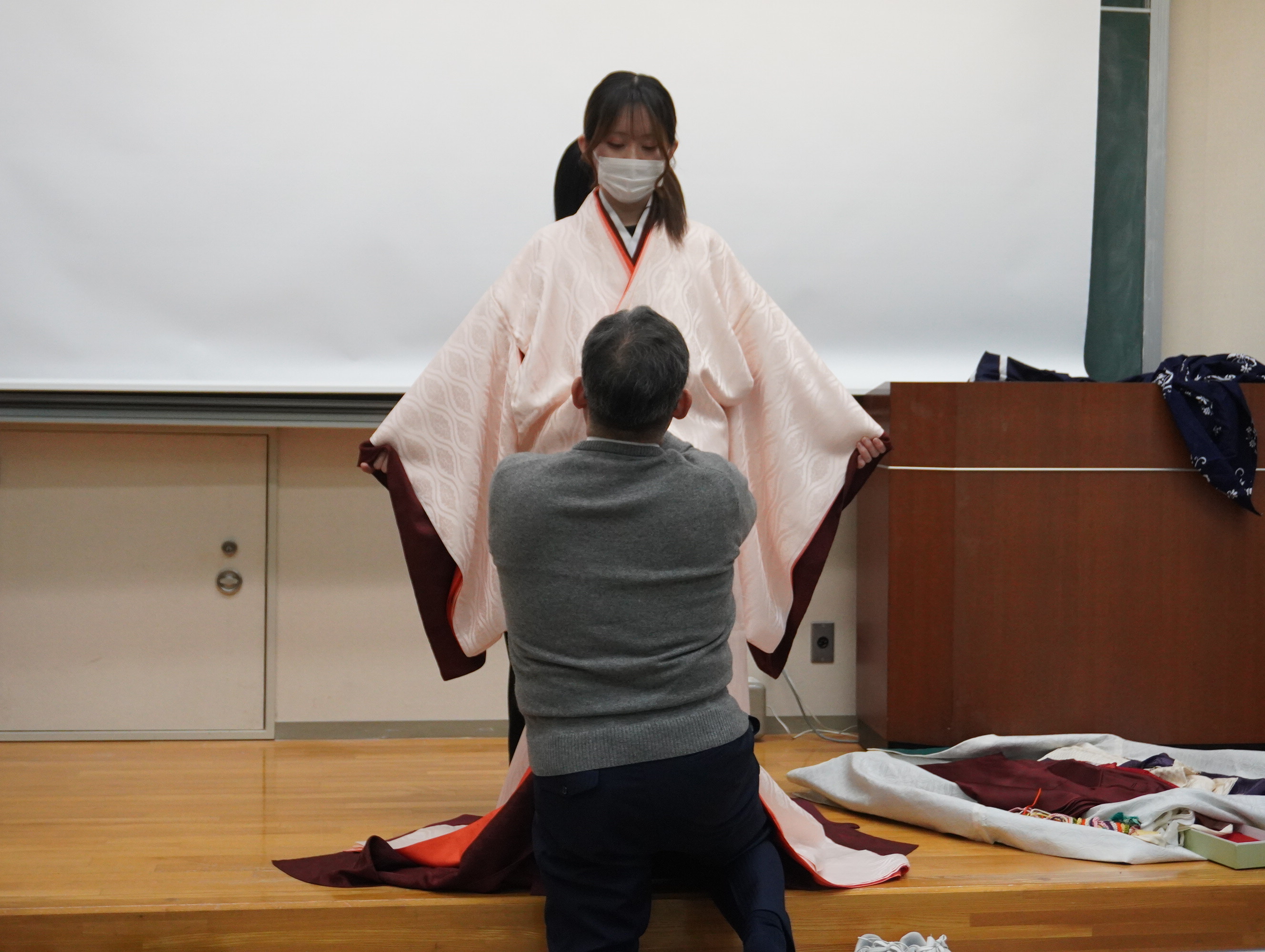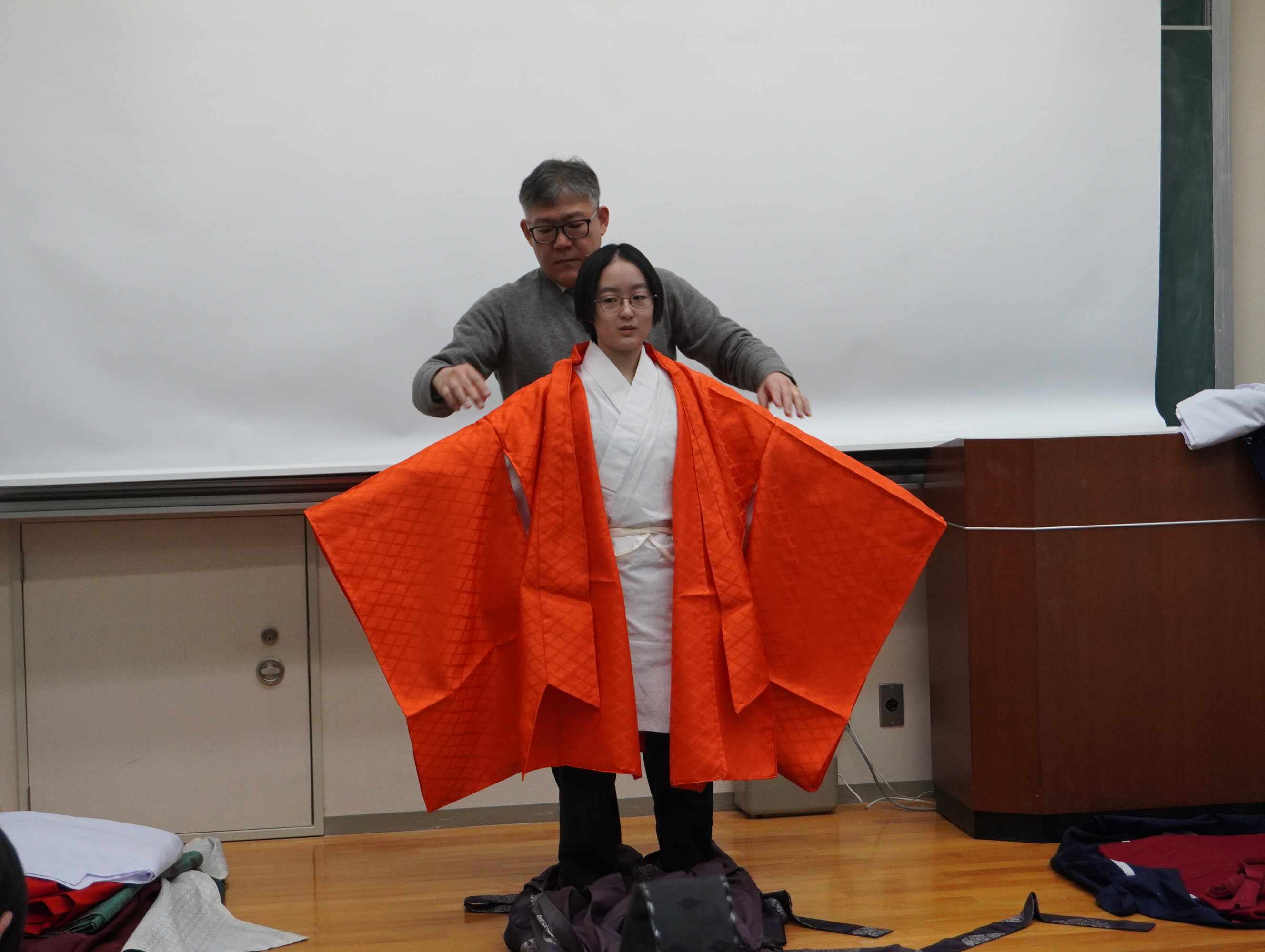例年、後期集中講義で開講されている「有職故実( ゆうそくこじつ )」で、装束の着装体験を行いました。