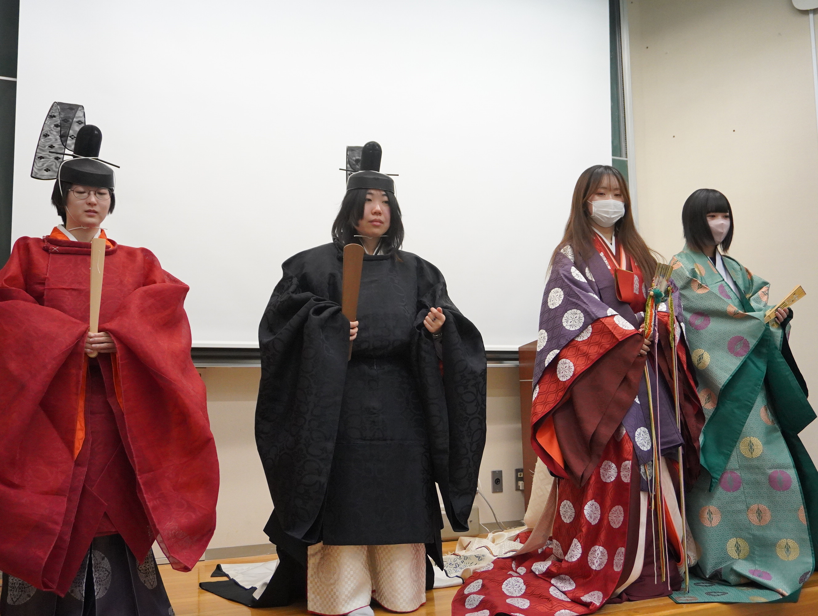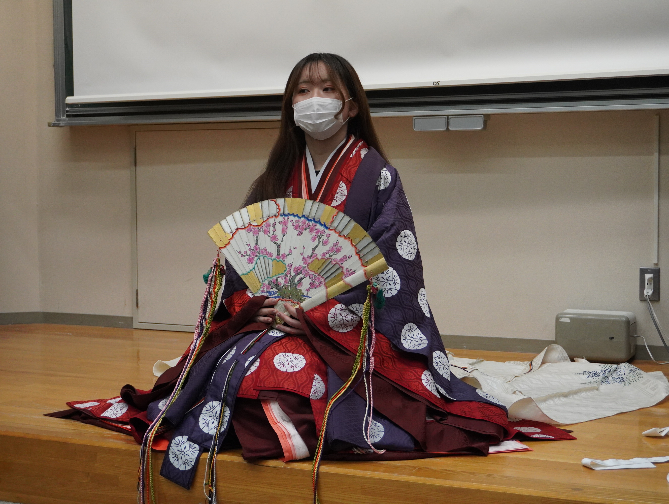 担当教員の霞会館記念学習院ミュージアム EF共同研究員 田中 潤 先生に着装指導いただき、学生も着装のお手伝いをしながら、「衣冠(いかん)」「束帯(そくたい)」「十二単(じゅうにひとえ)」「袿 ( うちき )」の着装体験を行いました。